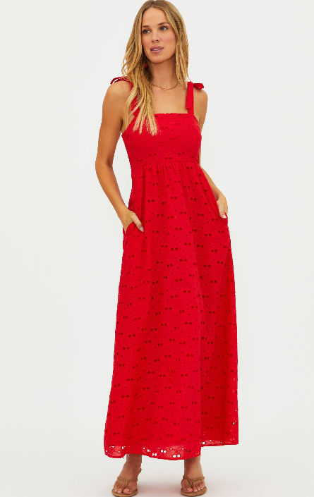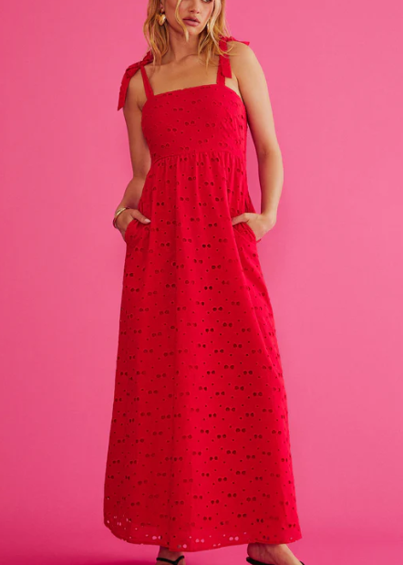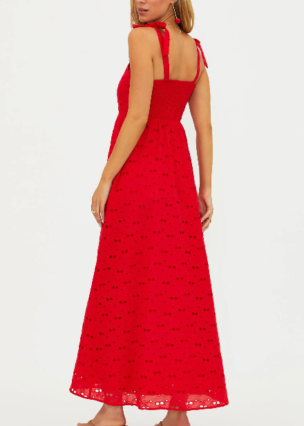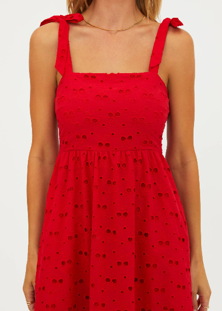 The Beach Riot Charlotte Dress in Cherry Eyelet features an eye-catching design and a flattering silhouette, perfect for summer events or casual outings. Its lightweight fabric ensures comfort and effortless style all season long.