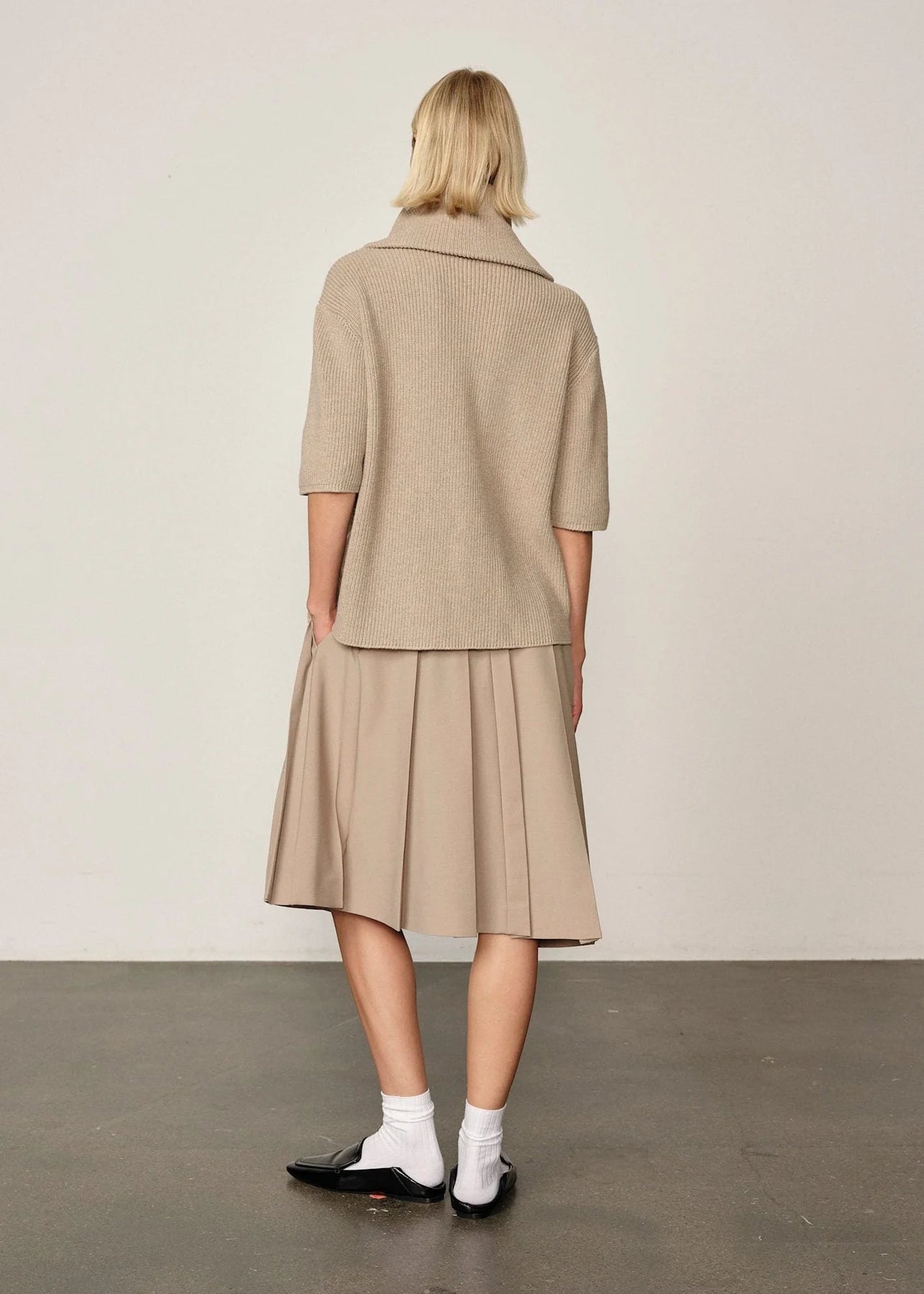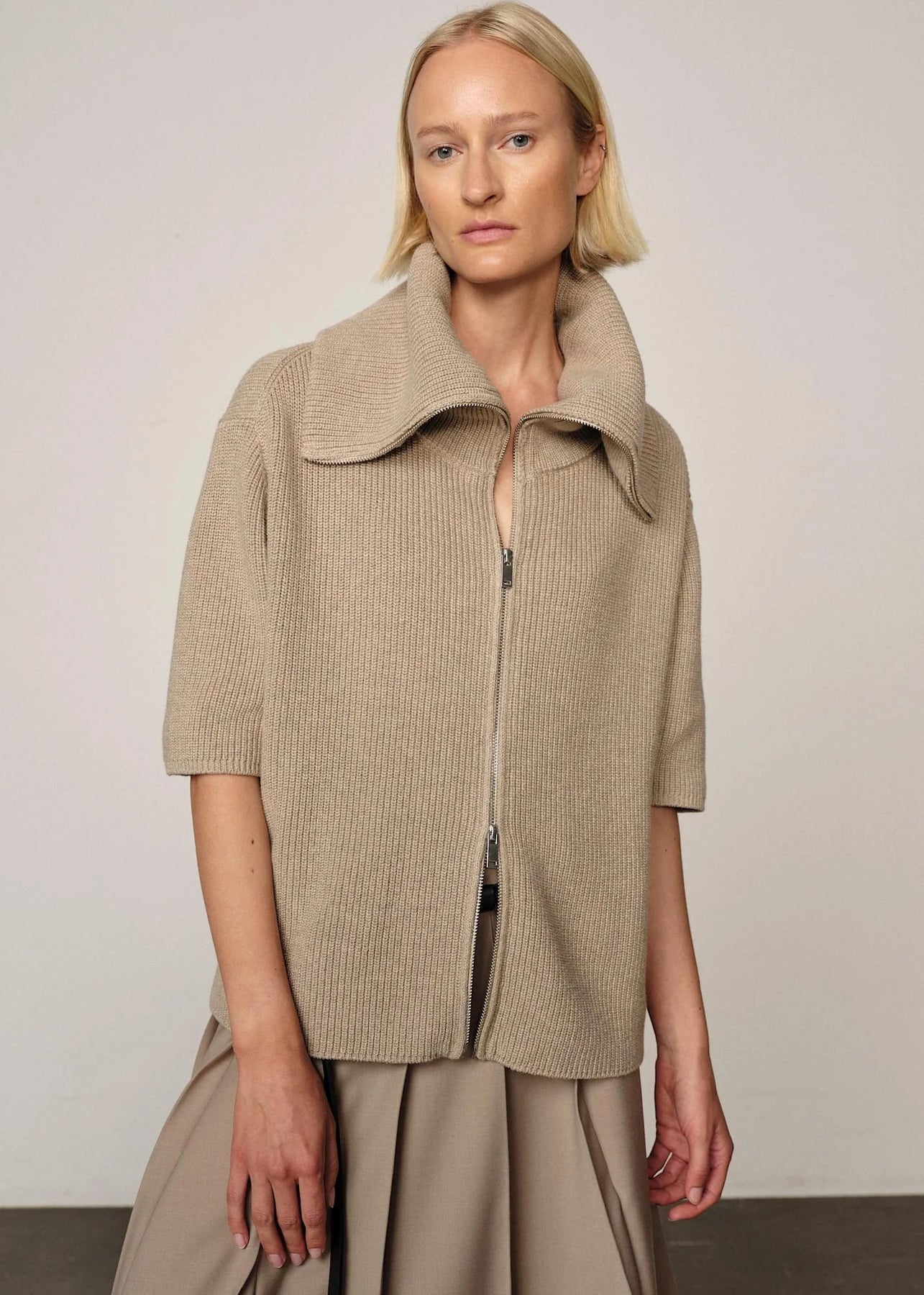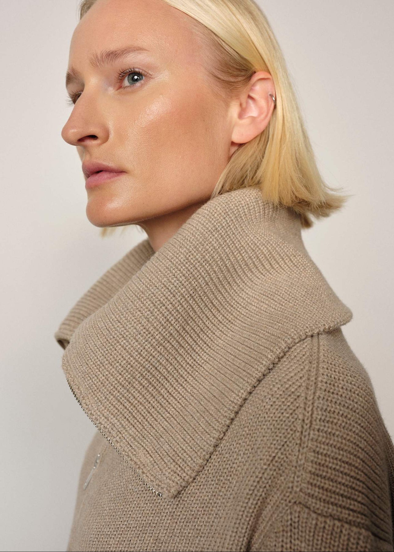 The Herskind Adanne Knit Cardigan in Croissant features a cotton-cashmere blend with 95% organic cotton and 5% cashmere for a soft, luxurious feel. Designed with an oversized collar and zipper front, it offers both comfort and style.