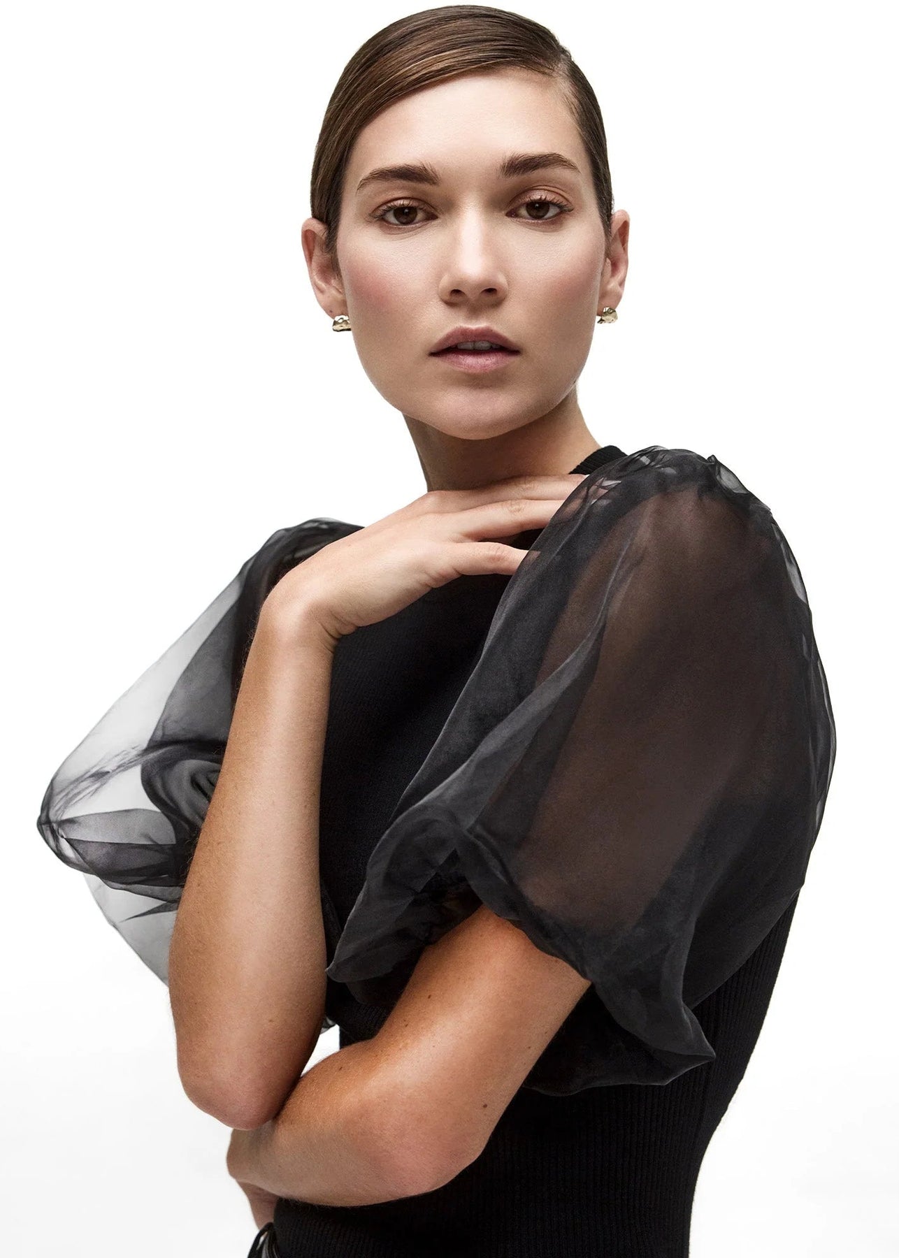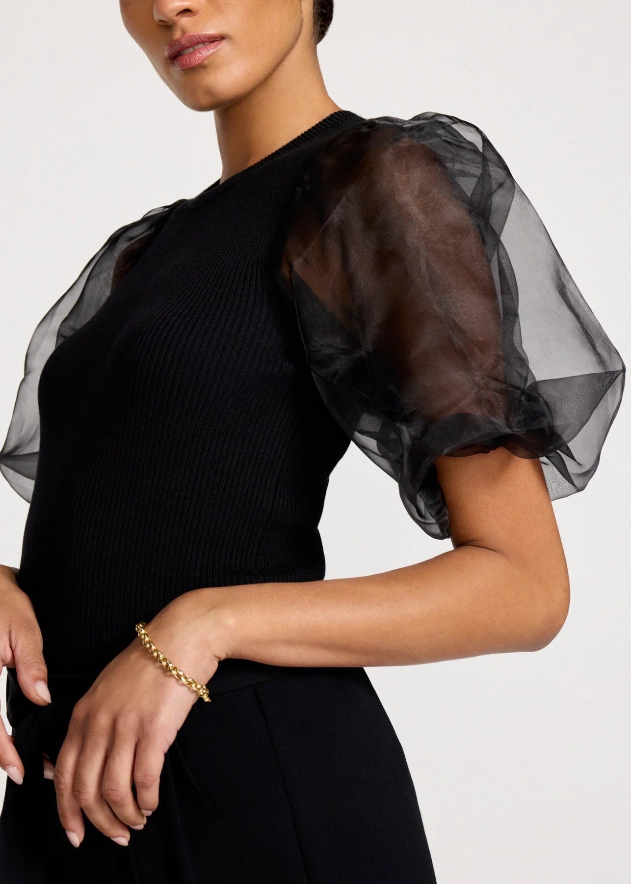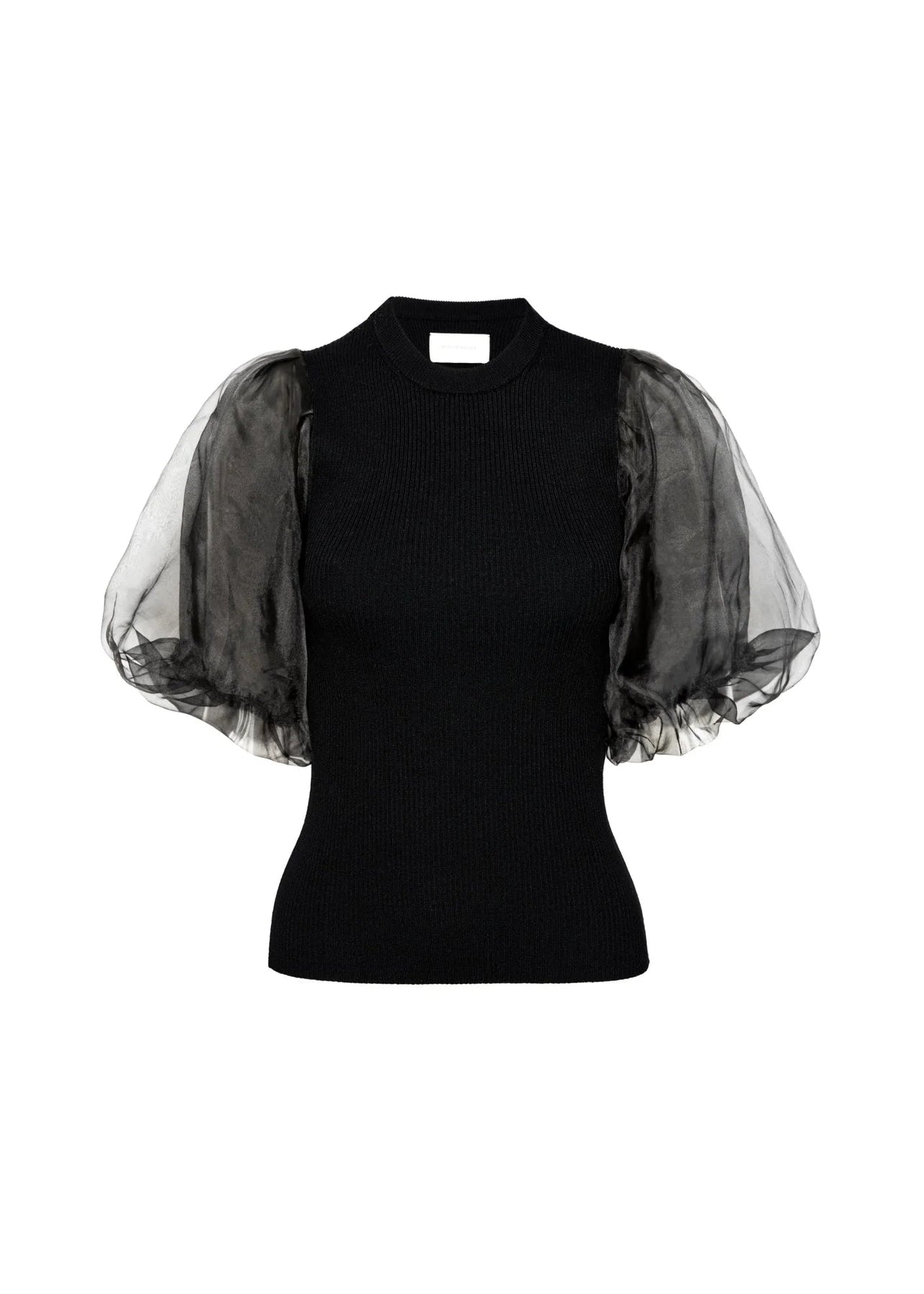 The Brochu Walker Marie Top in Black Onyx features luxurious fabric and an elegant design, complemented by mesh pouf sleeves for a sophisticated touch. Its versatile style makes it suitable for both casual and formal occasions.