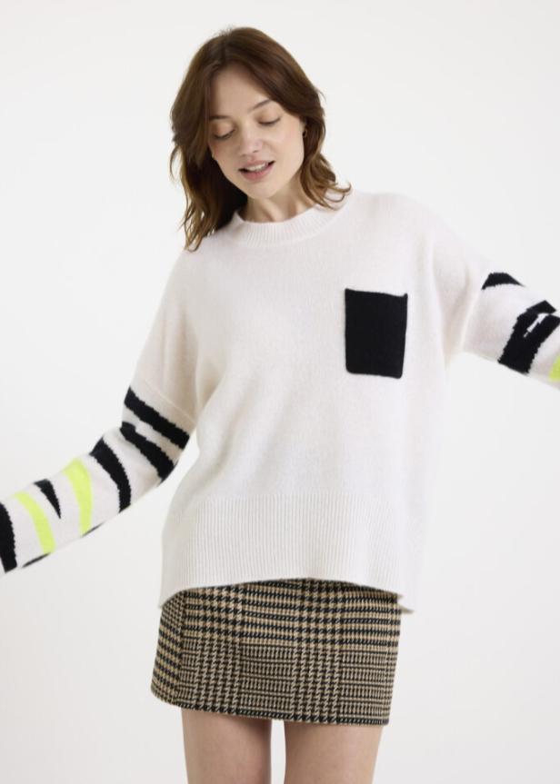 Brodie Pop Zebra Cashmere Boyfriend Sweater Organic White/Black Neon