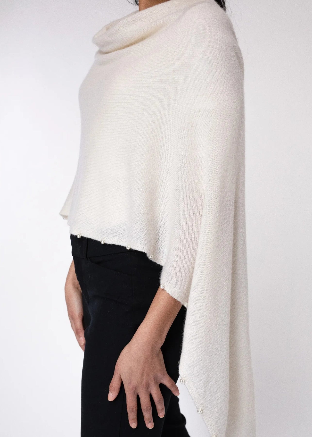 Crafted from 100% cashmere, the Alashan Cashmere Pearl Trim Poncho in white features elegant pearl detailing and versatile styling options. Designed as one size fits most, it offers both luxury and adaptability for any wardrobe.