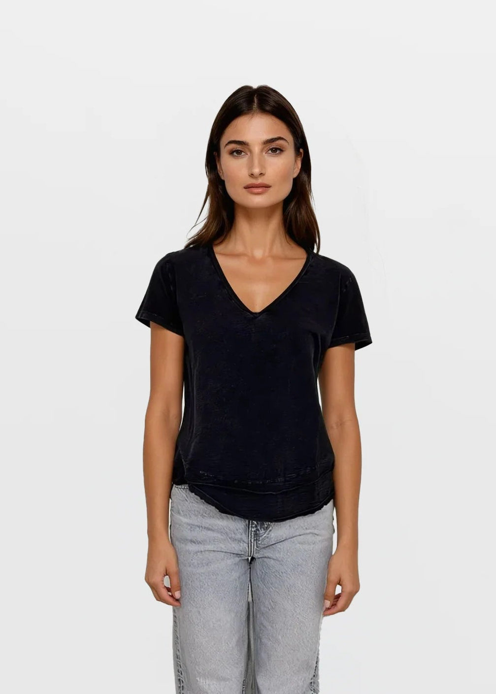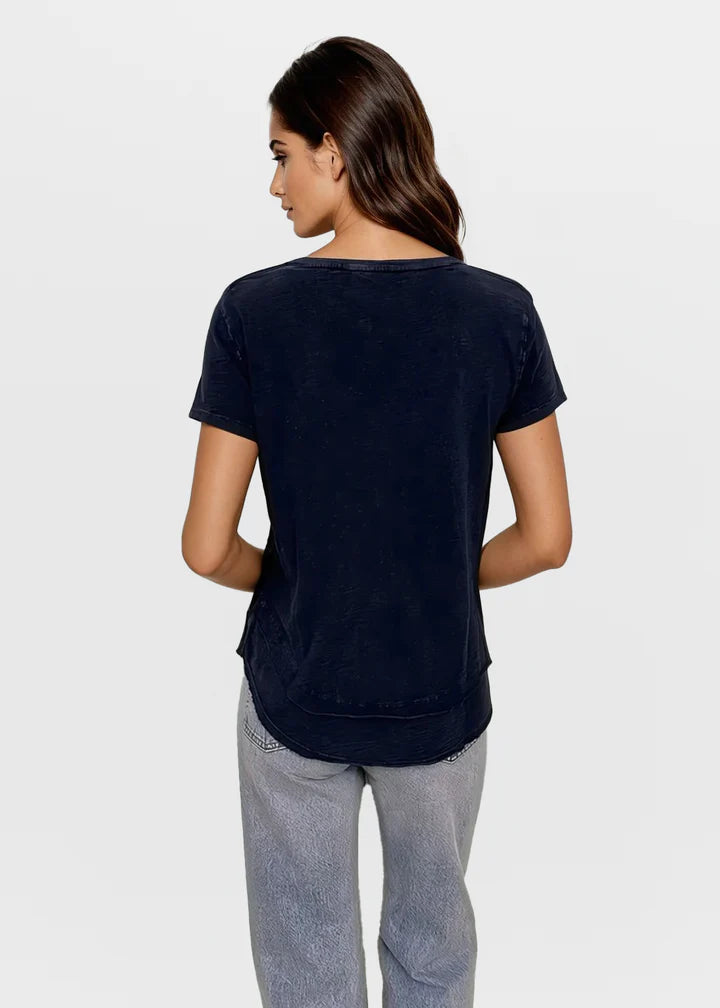 The CHRLDR Ava Mock Layer T-shirt in Indigo features a stylish v-neckline and a mock layer hem for a modern look. Made from 100% premium cotton, it offers all-day comfort and durability.