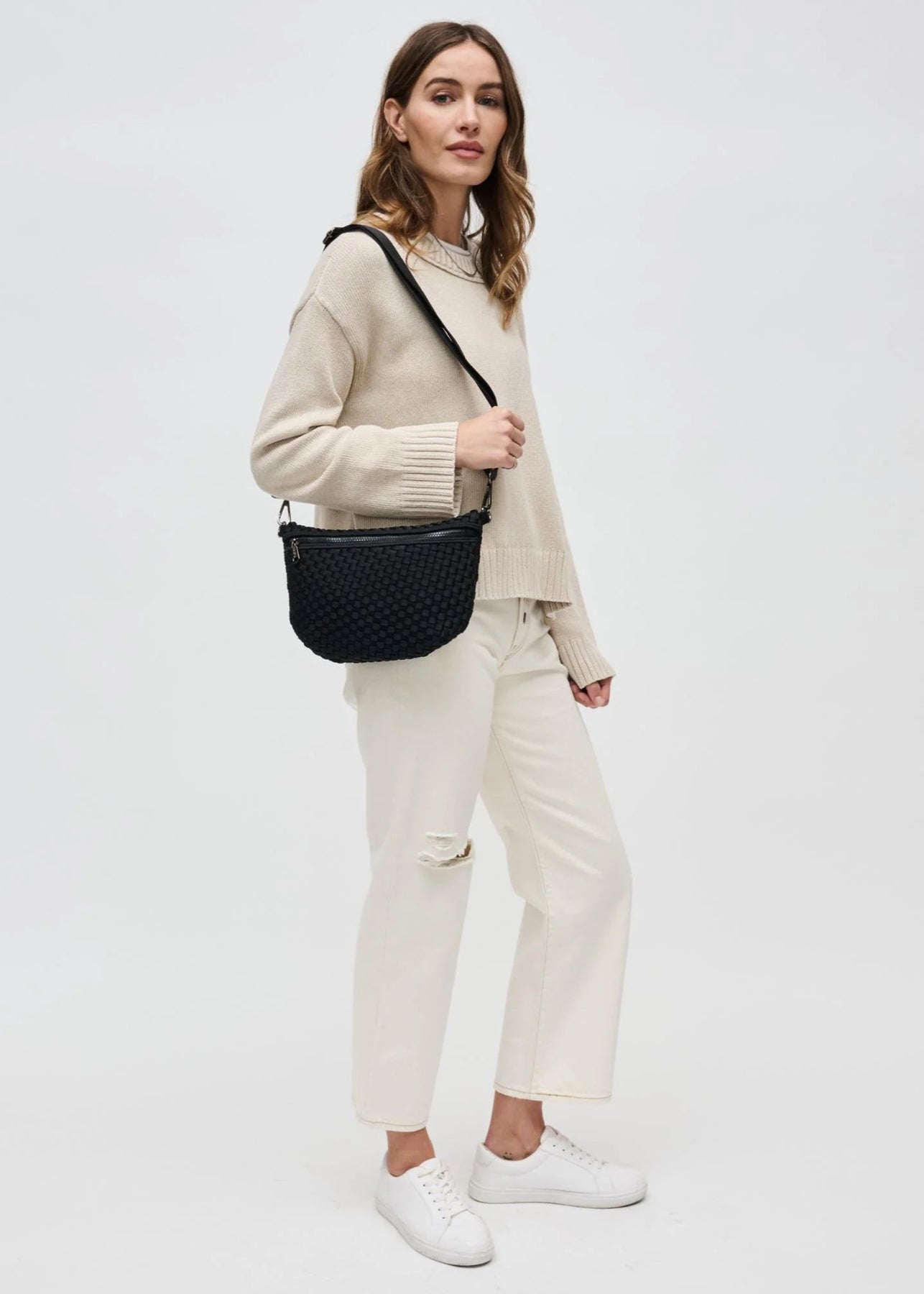 The Sol & Selene Ethereal Woven Belt Bag in black features a lightweight woven design for texture and durability. With an adjustable strap for use as a crossbody or belt bag and multiple zippers for organization, it offers both style and functionality.