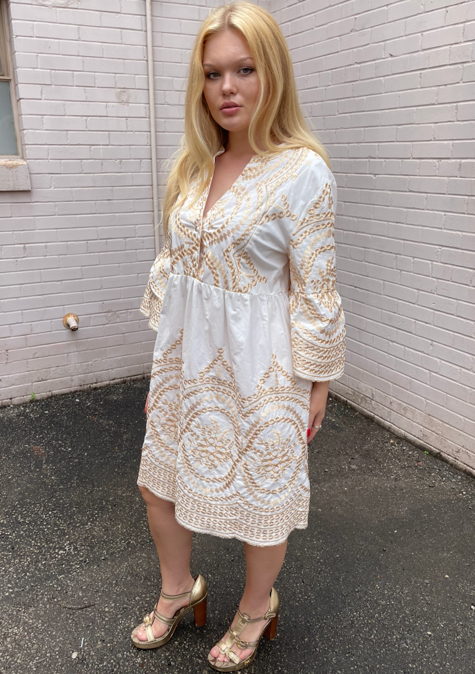 This delicate and flattering white bell sleeve babydoll dress comes with a beautiful gold embroidered pattern and a V neckline for a touch of elegance. Perfect for any occasion, this stylish but comfortable short dress is sure to make you stand out!