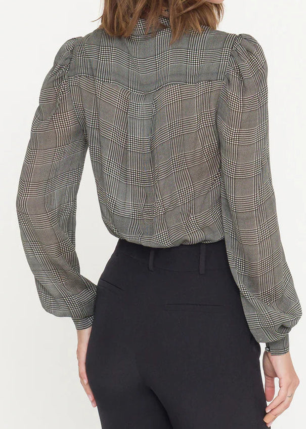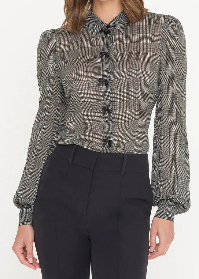 The Generation Love Arly Bow Blouse features a chic white and black plaid design with elegant pouf sleeves, offering a stylish yet versatile look. Crafted from high-quality materials, it provides both comfort and timeless appeal.
