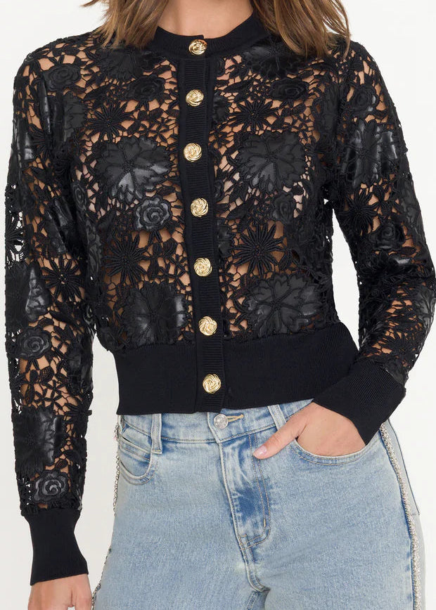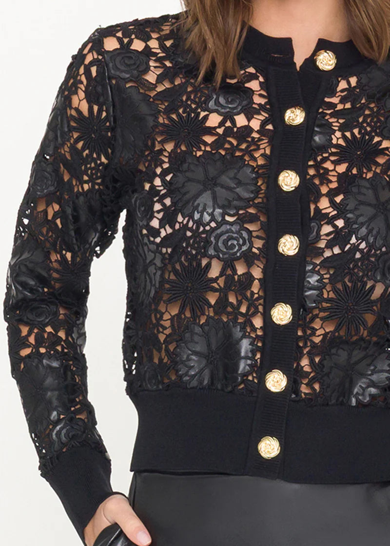 The Generation Love Erin Vegan Leather Lace Cardigan combines sleek vegan leather with intricate lace detailing for a modern yet feminine look. Finished with gold buttons, this cardigan offers a stylish and cruelty-free wardrobe option.