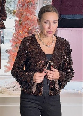 The Pink Door Sequin Tie Front Jacket in brown features shimmering sequin embellishments and a stylish tie front design. Its unique color adds a distinctive touch to any wardrobe.