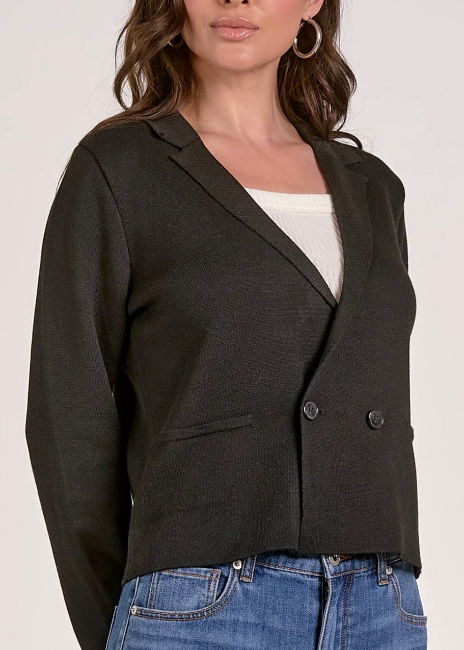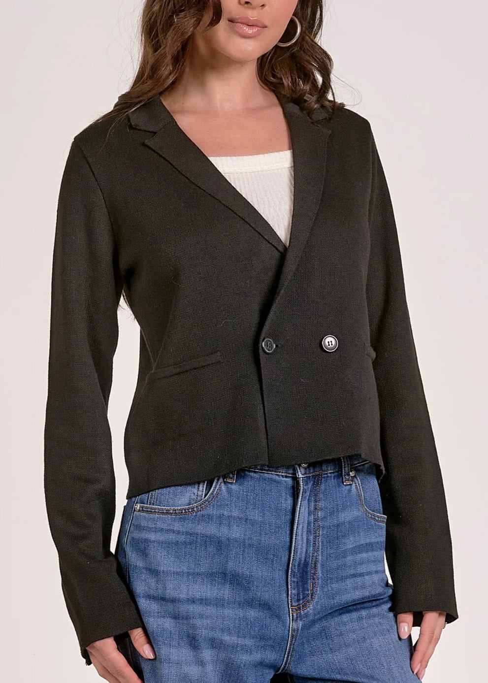 Elevate your style with The Pink Door Short Knit Jacket in classic Black. This collared jacket features a chic front 2-button style, adding a touch of sophistication to any outfit. Stay cozy and trendy with this must-have piece from The Pink Door!
