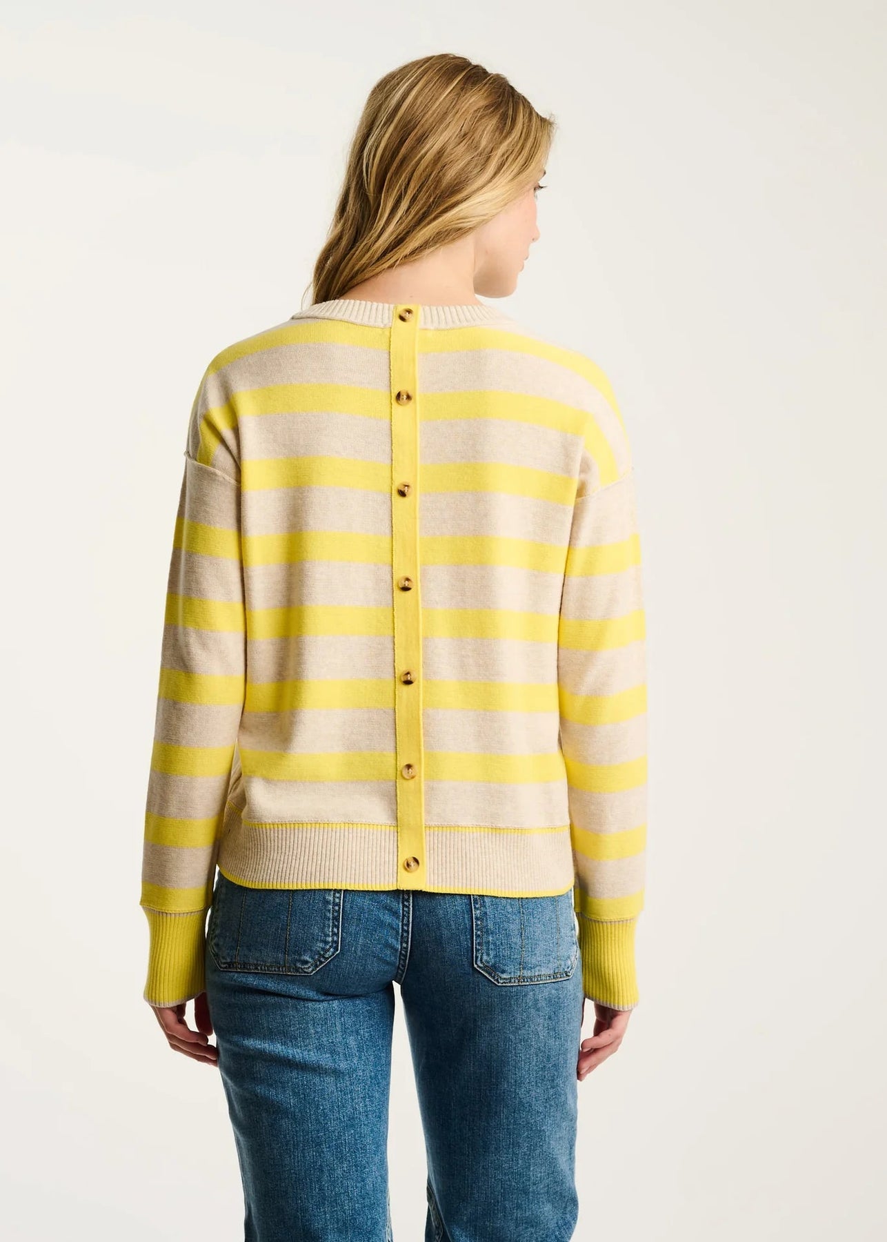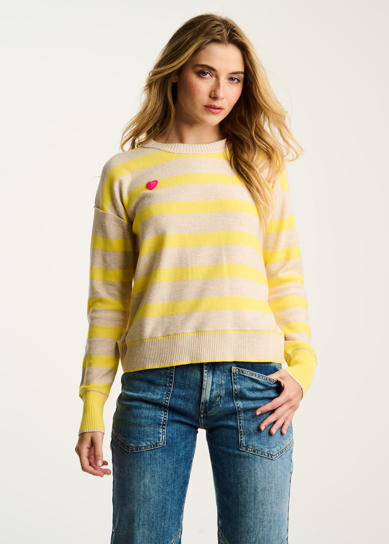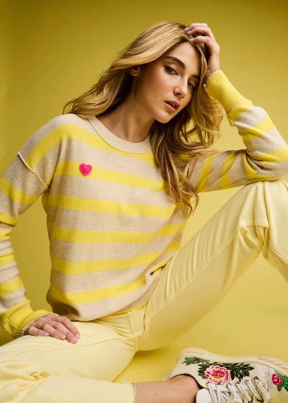 The Lisa Todd Subtle Love Almond/Butter sweater features 100% cotton for a luxurious feel and modern design. Accented with a vibrant heart and button details at the back, it offers versatile styling for any occasion.