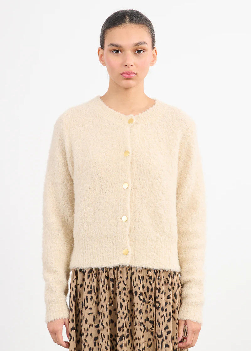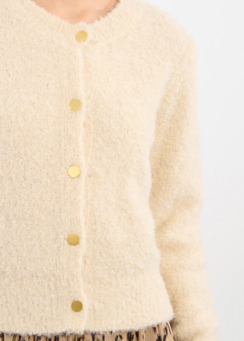 This Molly Bracken Boucle Cardigan in cream features a textured knit, long sleeves, and a round neck. Designed with gold buttons and ribbed finishes on the neckline, cuffs, and hem for a polished look.