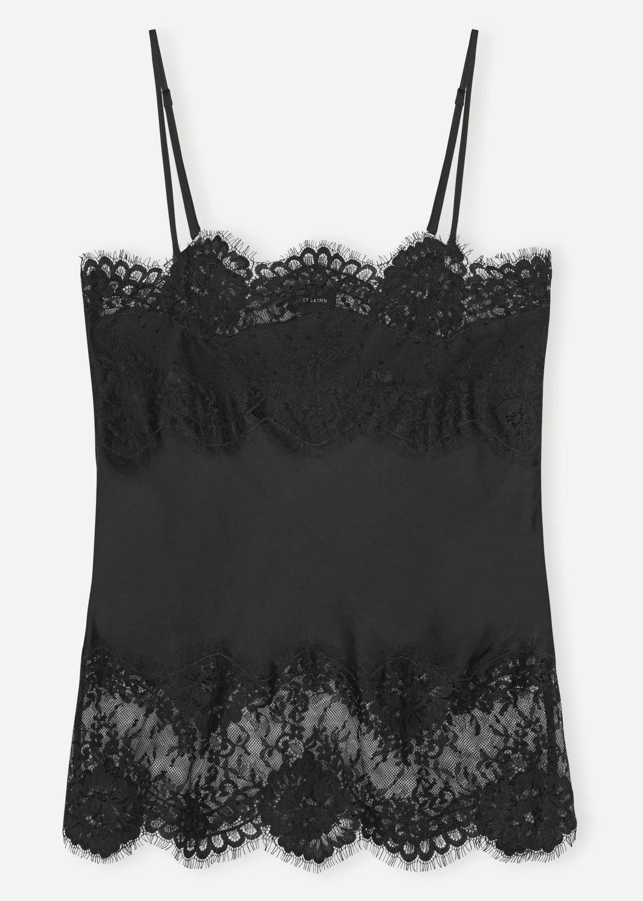 The Herskind Linnea Top in black features elegant lace detailing on the neckline and hem, offering a refined and timeless look. Perfect for versatile styling options.