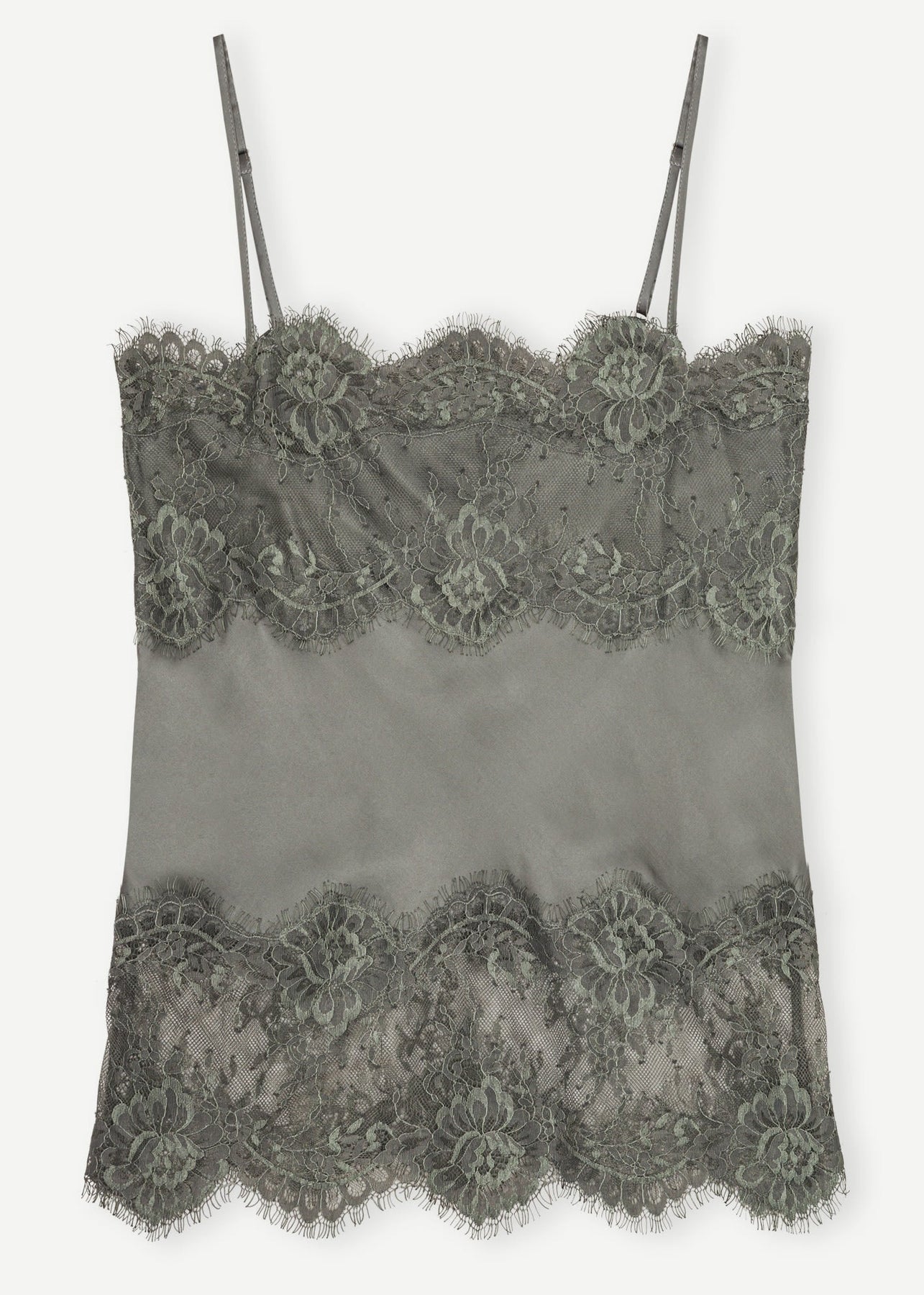The Herskind Linnea Top in dark grey features elegant lace detailing along the neckline and bottom, offering a sophisticated and timeless look. Perfect for both casual and formal occasions.