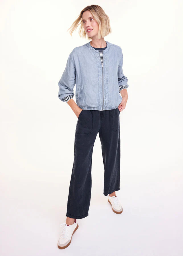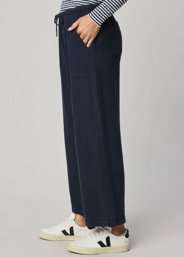 The Splendid Angie Crop Wide Leg Navy features a roped drawstring waist, patch pockets, and a wide-leg silhouette that hits above the ankles for a relaxed yet polished look.