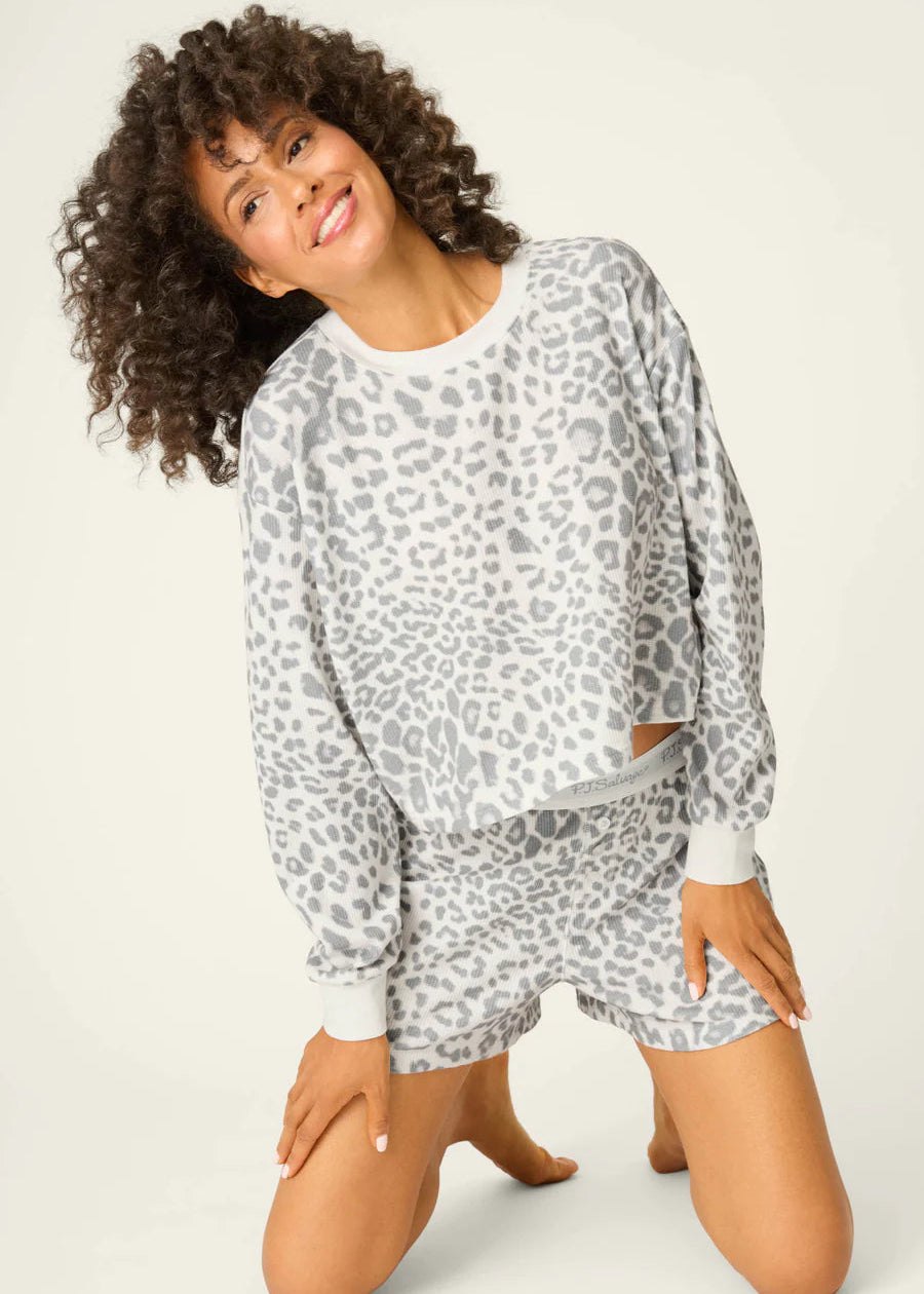 The PJ Salvage Boyfriend Boxer Leopard Print Shorts Set features a stylish leopard print and a natural color palette, perfect for comfortable loungewear. This matching set offers a relaxed fit for all-day ease.