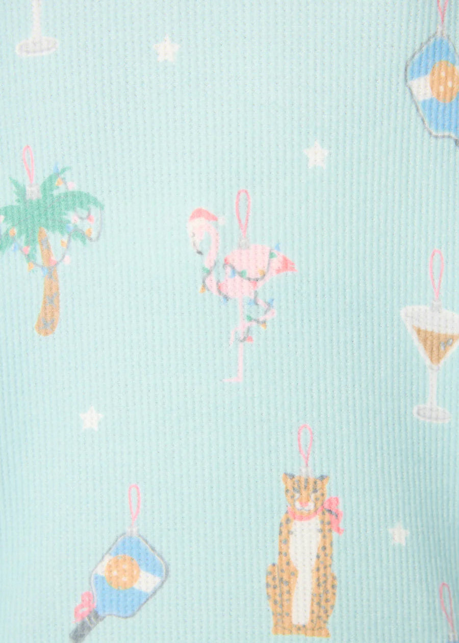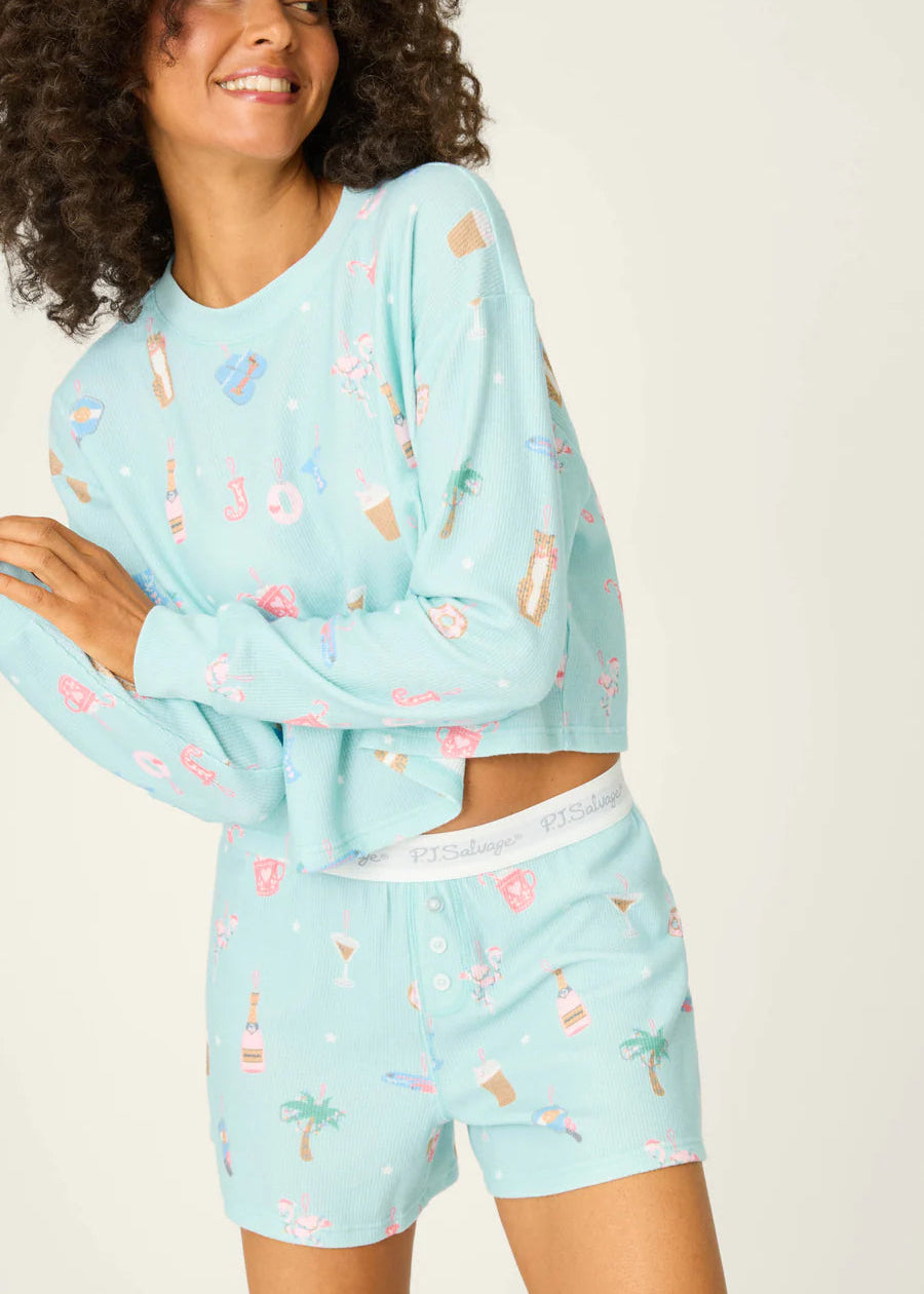 The PJ Salvage Boyfriend Boxer Ornament Print Shorts Set in light mint features a cozy loungewear design with an adorable print and a comfortable fit, perfect for relaxed days at home.
