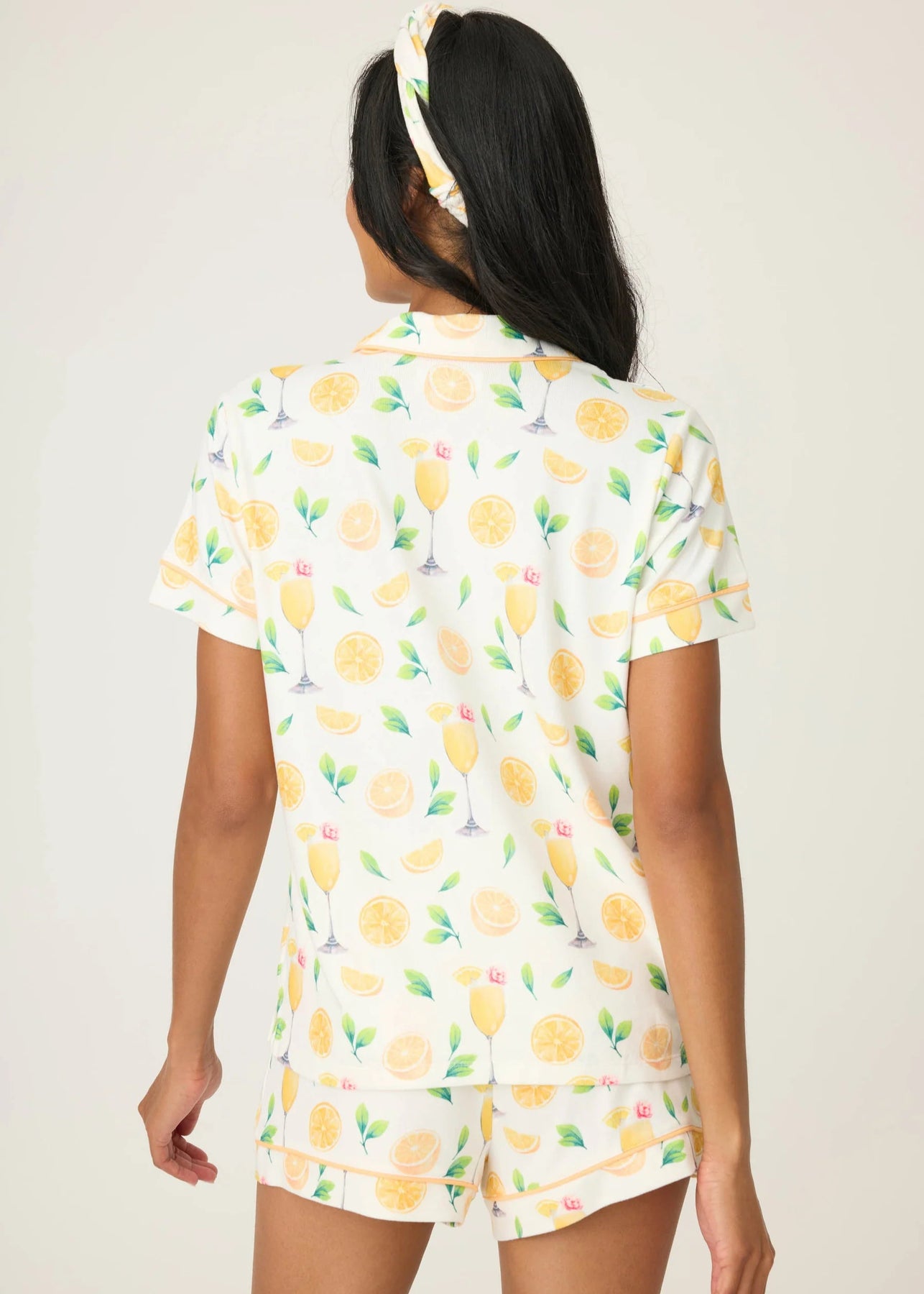 The PJ Salvage Mimosa Me 3-Piece PJ Set features a breathable cotton blend with a playful tropical print of fruits and drinks. Includes a button-up shirt, elastic waistband shorts, and a matching tank for ultimate comfort.