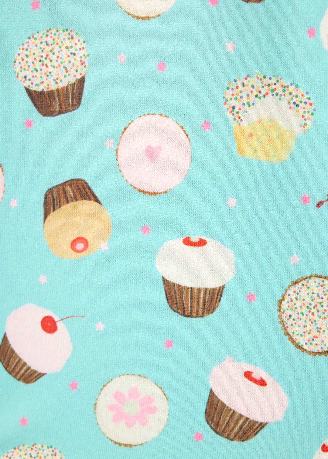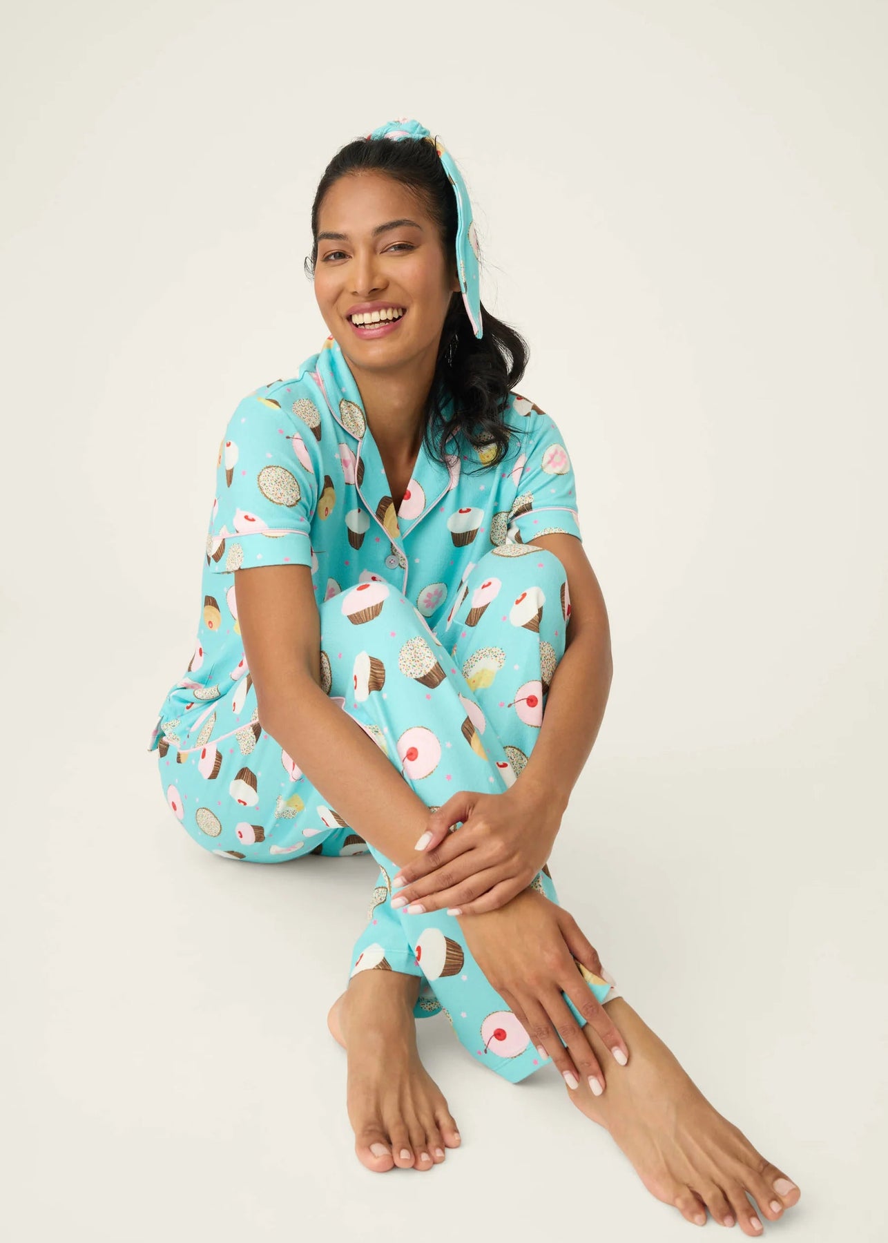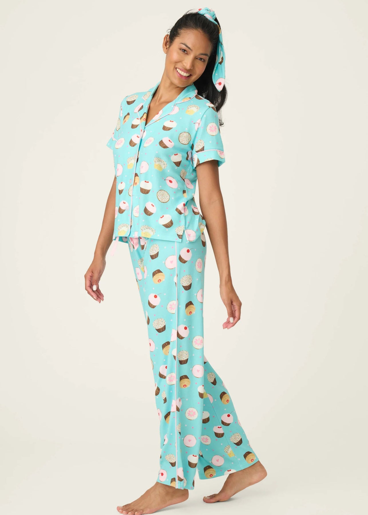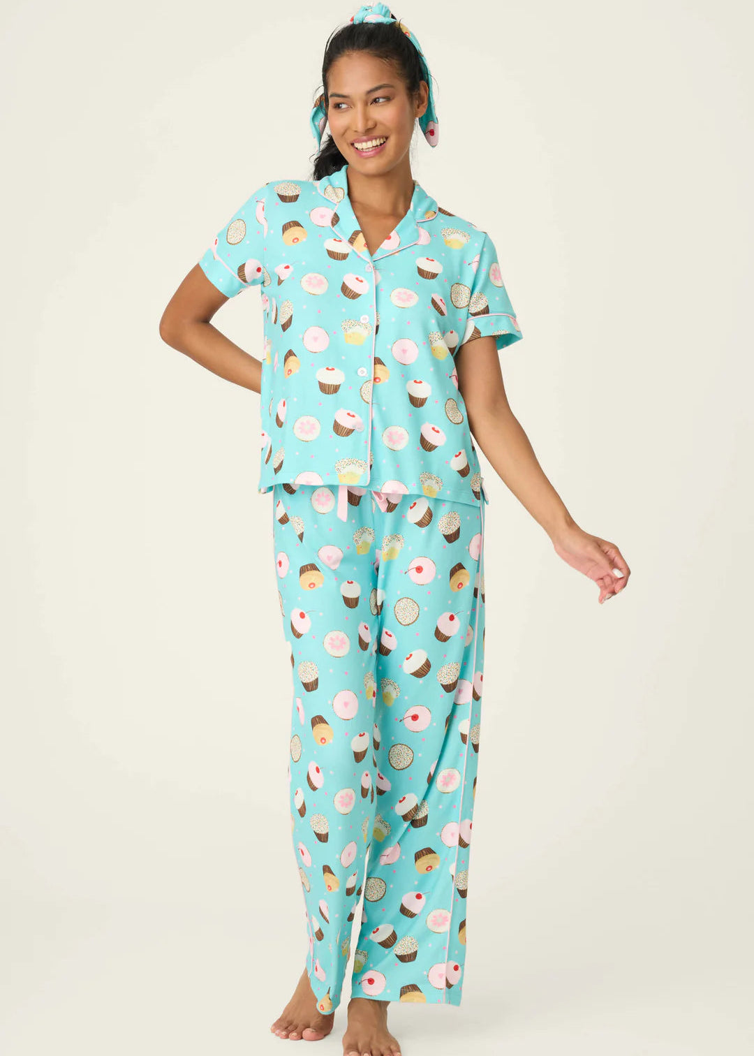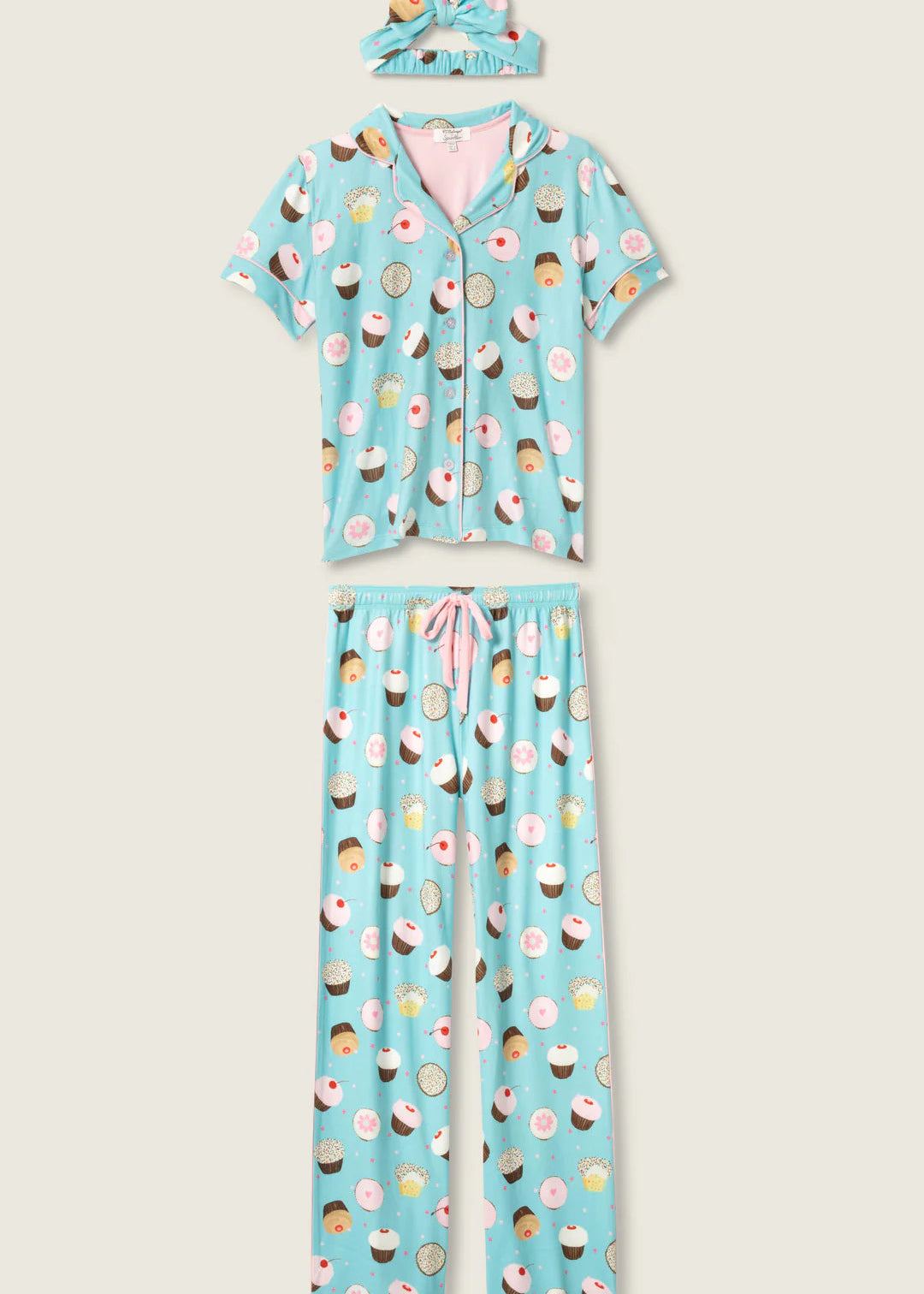 The PJ Salvage Sweet Life PJ Set in Bright Aqua includes a 3-piece set featuring a cupcake print, short-sleeve button-down top, wide-leg pants, and a matching headband for a coordinated look.