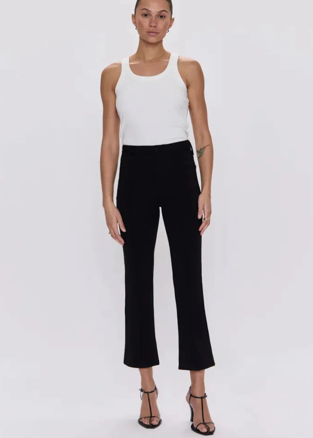 The Pistola Saskia High Rise Ankle Boot Pant features a flattering high-rise waist paired with an ankle boot cut for a sleek, leg-elongating silhouette. Designed for both style and comfort, it's perfect for a night out.