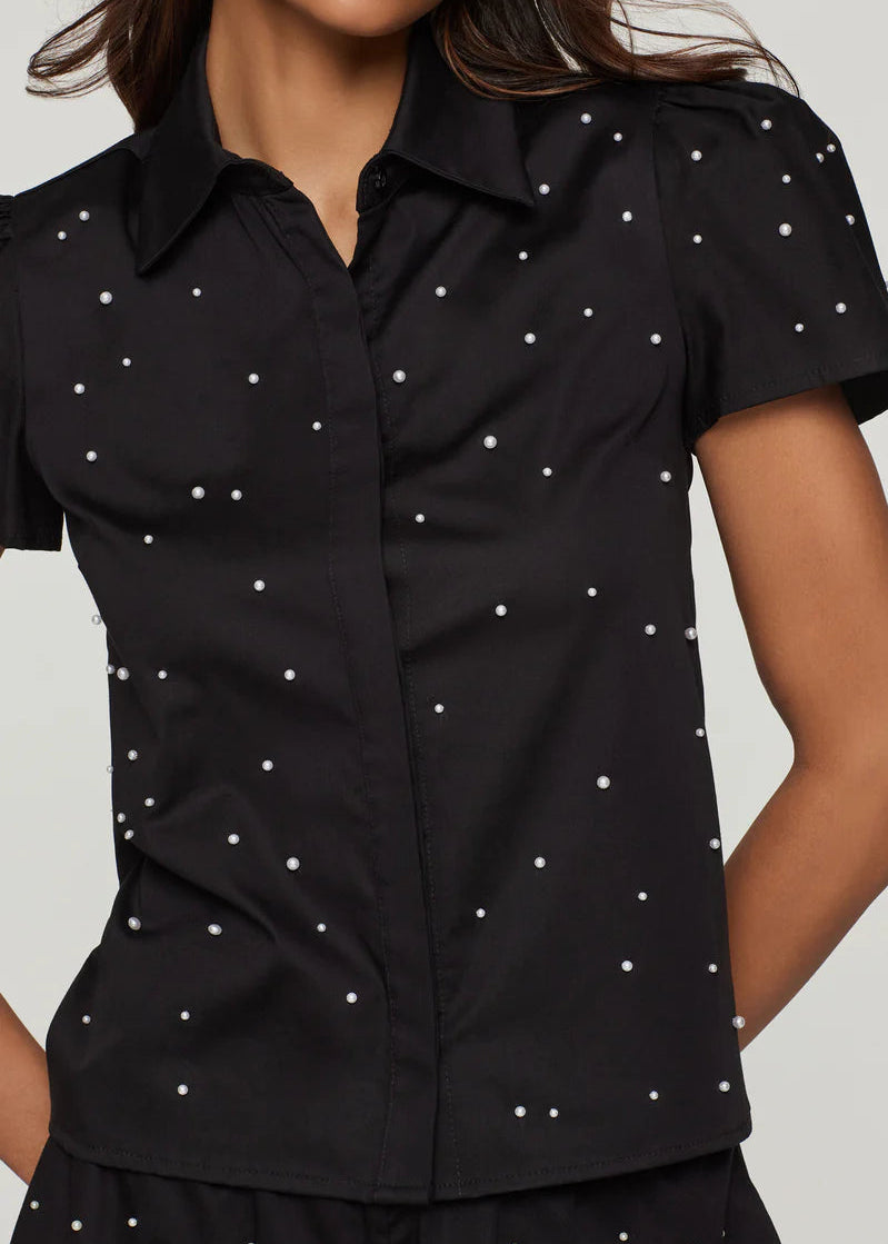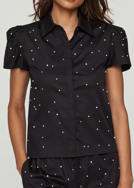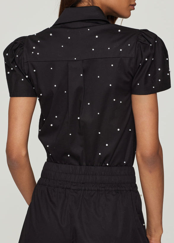 The Generation Love Murphy Pearl Embellished Poplin Shirt features crisp black stretch poplin with short sleeves, a button-down design, and delicate pearl embellishments for a refined touch.
