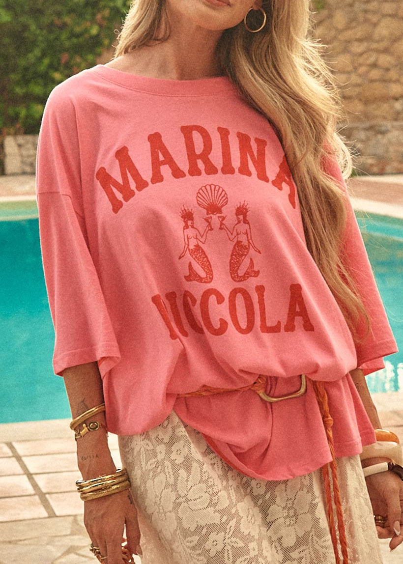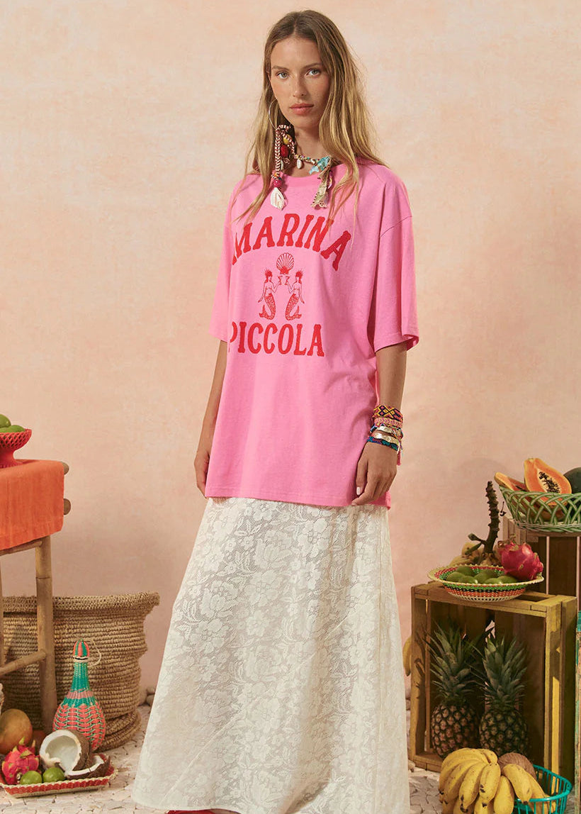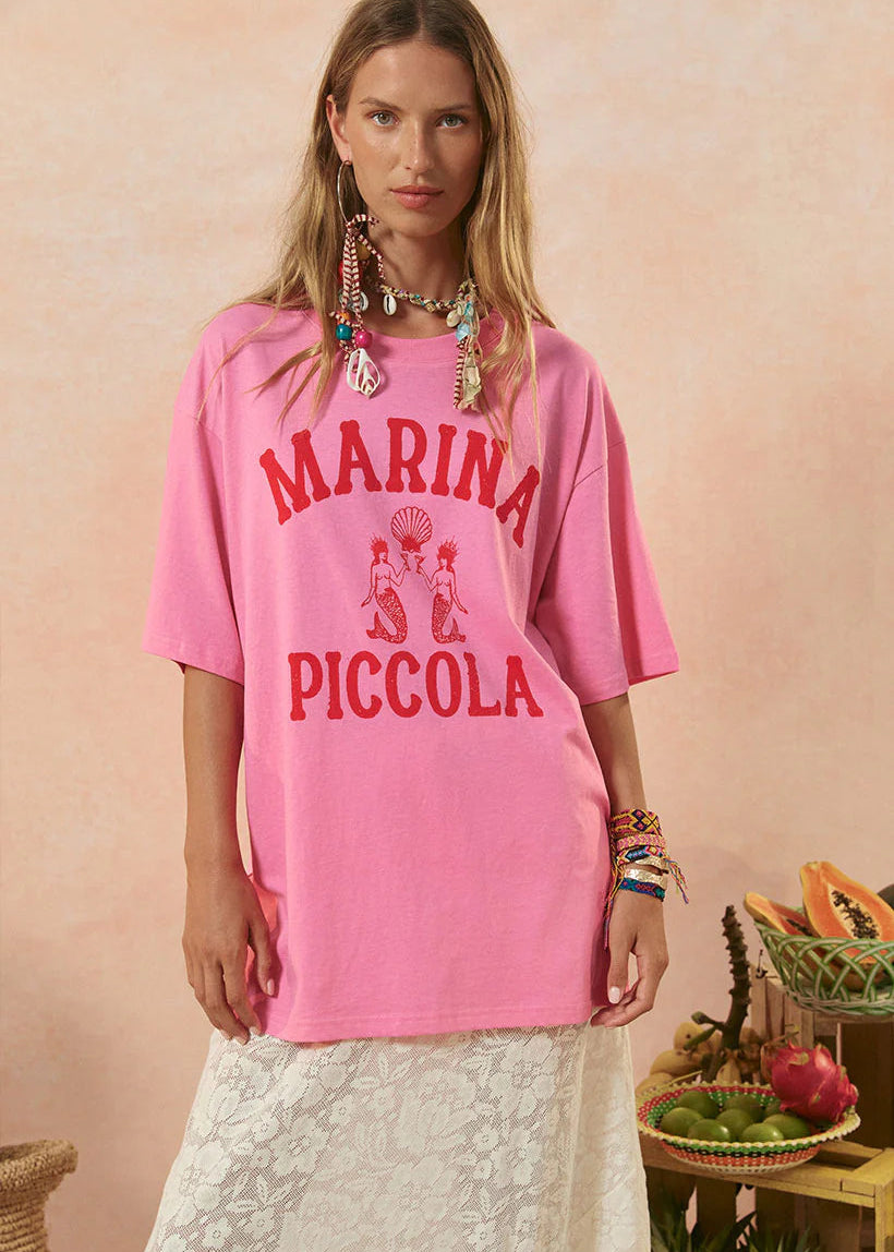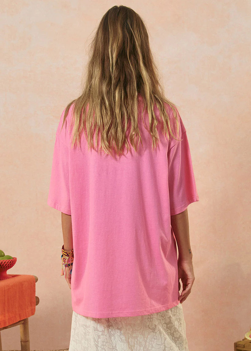 The Spell Marina Piccola Oversized Biker Tee in pink features a bold color and a unique design, paired with a relaxed oversized fit for effortless style and comfort. A versatile addition to any casual wardrobe.