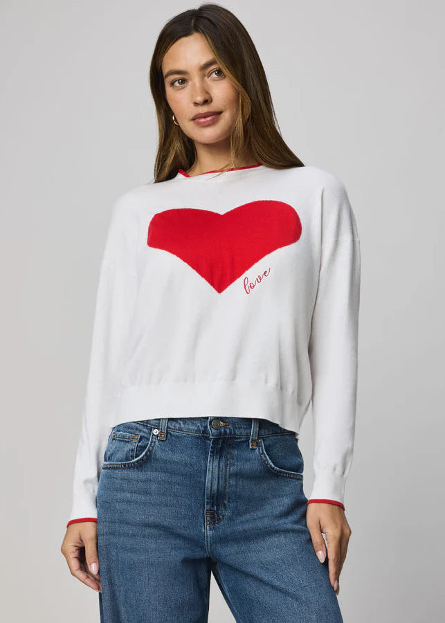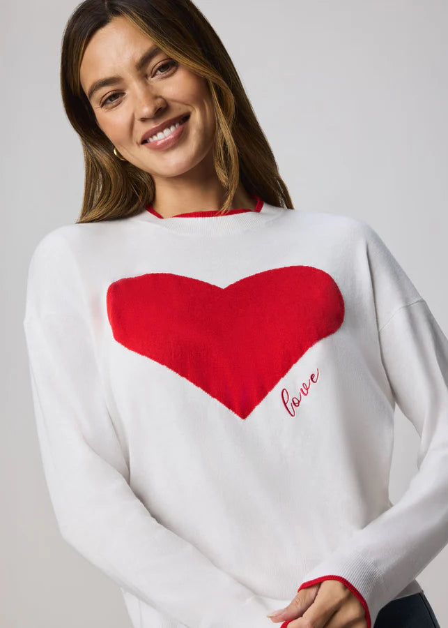 The Splendid Leah Love Sweater in White/Rouge features a soft, cozy knit with a heart print on the front and embroidered 'love' script. Designed with long sleeves and dropped shoulder seams for a relaxed fit.