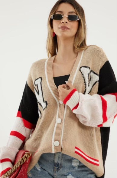 The Pink Door Red & Beige NY Varsity Knit Cardigan